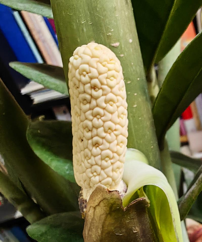 花序类型:雪铁芋的花为佛焰状花序,从植株基部或根茎处抽出细长的花枝,顶部发育出花苞。花序呈肉穗状,外层包裹绿色或浅绿色的佛焰苞(形似船形并反卷),内部为黄白色或浅黄色的肉穗花序。