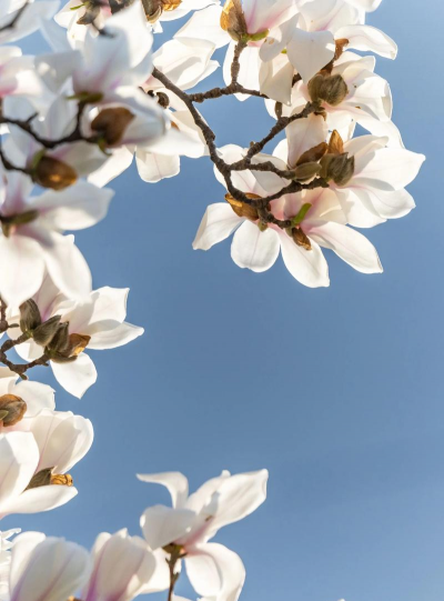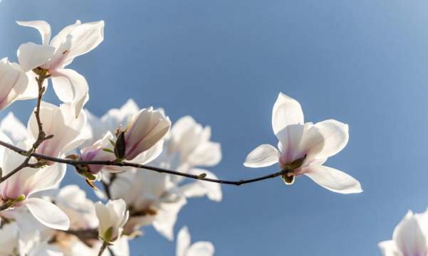 玉兰:2-3月开放,花朵硕大,有白玉兰、紫玉兰等品种,北京地区称其为“望春花”。