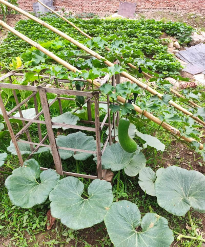 冬瓜藤蔓长至8-10cm时需搭架,可用砖木或竹竿搭建“人字架”“四方架”等,确保通风透光。