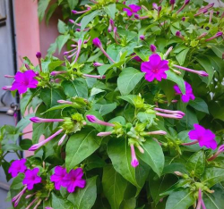 紫茉莉傍晚开花,清晨闭合,花香浓郁,耐热耐阴。种子像小地雷,落地后第二年可自然发芽,适合房前屋后种植。