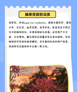 彼岸花是一种拥有众多别名的植物,在不同文化和地区有不同的称呼。以下是彼岸花的主要别名及其来源: