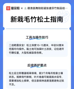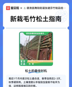 移栽技巧 :挖60厘米深穴,填入厩肥或塘泥,将母竹紧靠穴壁定植,填土时浇透定蔸水,覆土呈“龟背状”以增强抗旱性。