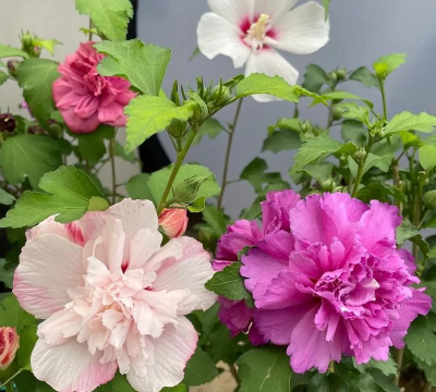 粉紫重瓣木槿:花粉色或紫色,重瓣,花径较大,常见于山东等地栽培。