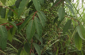 花果:圆锥花序长达30厘米,花稀疏微小,黄绿色;核果肾形或斜卵形,成熟时呈金黄色或白色,深秋叶片霜后变红,观赏性强。