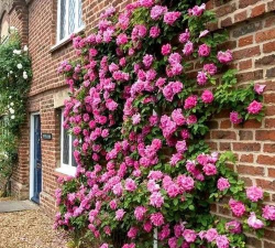 凌霄花生长霸道,地栽无需管理即可迅速覆盖墙面,夏季开花橘红色。但需注意其根系可能破坏墙体或防水层,适合庭院围墙。