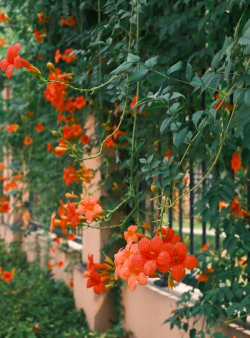 特点:橘红色喇叭状花朵,攀附能力强,耐寒耐旱,适合墙面或栅栏,5-8月开花。