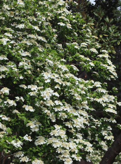 琼花属忍冬科落叶灌木,4-5月开花,花大如盘、洁白如玉,聚伞花序形态独特,被誉为“花中珍品”。