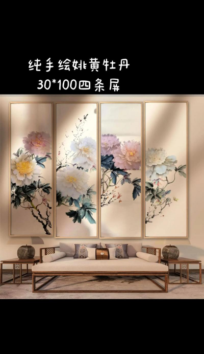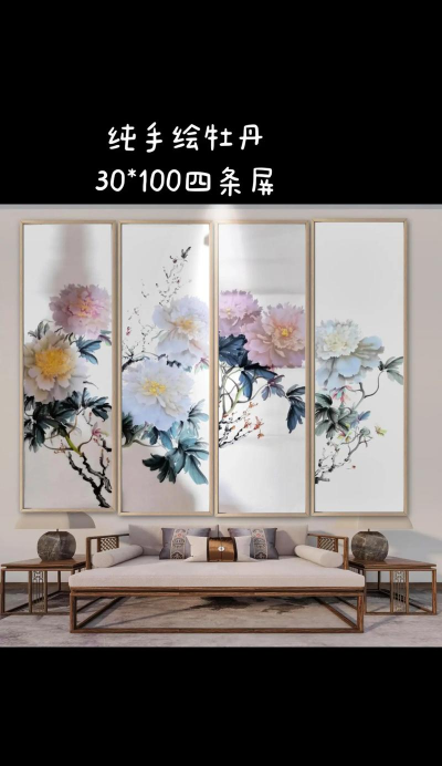 四条屏不是单幅画,尺寸要协调,常见是窄长条,四幅并排,也有方形组合,看墙面大小,大墙面,选大尺寸,有气势,小墙面,选小尺寸,更精致。