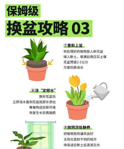 选择合适时间:最佳换盆季节是春秋两季(温度高于15℃),此时植物处于休眠期或生长初期,影响较小。不耐寒和常绿树种宜在春季进行;观花树种以花落后进行为宜;落叶树种以冬、秋、春季节最好。