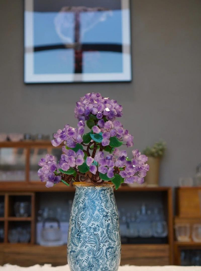 把泡好的水晶珠,放进花瓶底部,铺上薄薄一层,然后,把花枝插进去,调整好位置,你可以只用一种颜色,也可以混搭几种,这样看起来,层次会更丰富,特别好看。