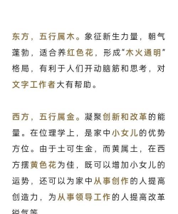 植物的颜色,也对应五行,红色属火,适合放在南方,能增强活力,白色属金,适合放在西方,有助于清净,绿色属木,适合放在东方,促进生长,你可以根据家的方位,选择相应颜色的花卉,简单调整,效果就不一样。