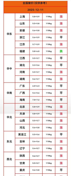 华东、华北、东北:涨幅明显,标猪主流报价达5.6-6.1元/斤(如上海5.8-6.1元/斤,山东5.6-5.9元/斤)。