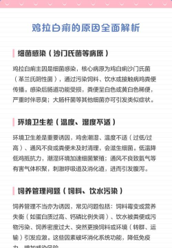 鸡拉白痢(白色稀便)通常是由鸡白痢沙门氏菌感染引起的传染性疾病,称为鸡白痢。以下是主要原因及相关分析: