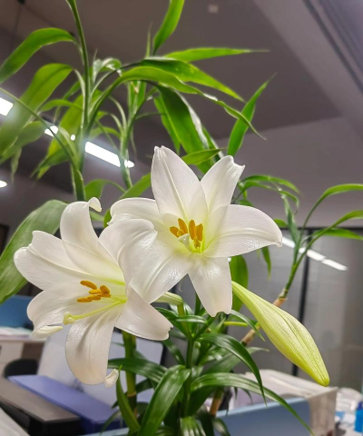 麝香百合(铁炮百合):花纯白色,喇叭形,筒部略带绿色,株形端直,象征纯洁。