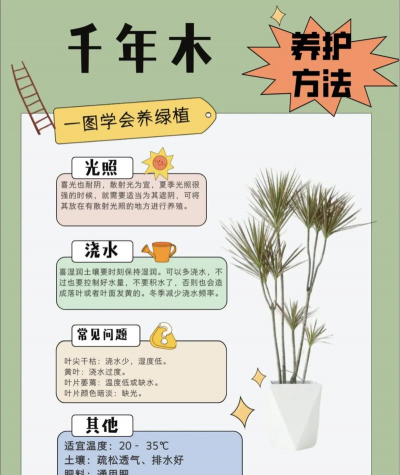 1、土壤:千年木喜富含有机质且透气性比较好的土壤,可选择腐叶土、泥炭土、河沙混合配制使用;2、浇水:千年木生长期,夏季每天浇水一次,其他季节适当调整即可;3、施肥:千年木生长期,每月施一次氮肥即可;4、光照:千年木生长期,需避免烈日暴晒,但也不能长期不见光。