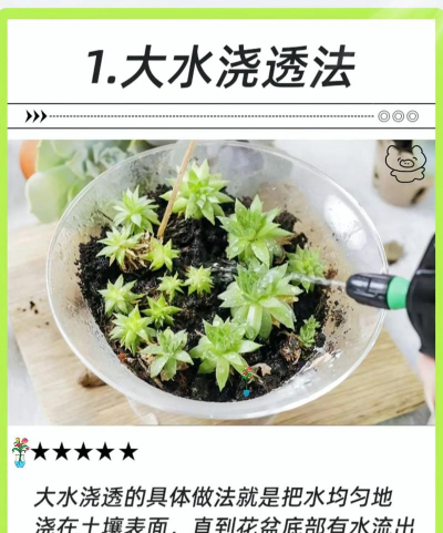 新栽种多肉:栽后3-4天再浇水,初期建议浸盆或沿根部少量浇水,避免伤口感染。