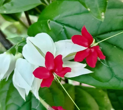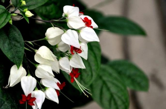 龙吐珠是马鞭草科灌木,花萼为白色,花冠为深红色,核果近球形,外果皮光亮,为棕黑色。它的花期为3~5月,整个花朵由白色、红色、黑色组成,观赏价值非常高。龙吐珠生长较快,播种后10天即可出苗,养护至第二年时就能开花。