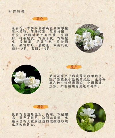 温度:茉莉花适宜生长温度为25-35℃,25℃左右开始孕蕾,30-35℃花蕾形成。低温(低于3℃)会导致冻害,高温则促进开花。
