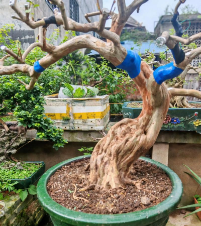剪扎结合:用棕丝或金属丝攀扎枝条,定型后及时解除,避免陷丝。适合制作斜干式、悬崖式或卧干式盆景。