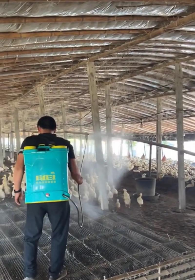 彻底清扫:先清除地面上的鸡粪、垫料、饲料残渣等污物,避免有机物影响消毒效果。污物可能携带病原菌(如大肠杆菌、沙门氏菌),需集中焚烧或堆肥发酵处理。