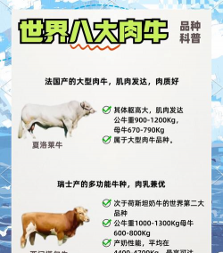 肉用品种:如夏洛来牛、安格斯牛,以及杂交品种如“比法罗”牛(美洲野牛与家牛杂交)。