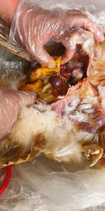 症状:羽毛松乱,腹泻(水样或带血),气囊炎、肝周炎等。