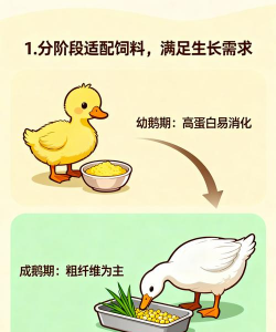 饲料过渡:各阶段饲料更换需逐步进行,避免应激。以上方法结合了雏鹅保温、中鹅放牧、育肥增重等关键环节,需根据实际条件灵活调整。更多细节可参考具体来源。