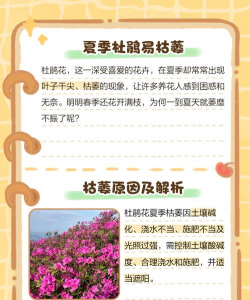 1、光照:夏季光线强烈,植株叶片容易被强光灼伤,植株会出现叶片干尖或干枯脱落现象。2、施肥:夏季高温,杜鹃花会进入休眠期,休眠期的植株无法吸收养分,这个时候施肥会导致植株遭受肥害,容易烂根。3、环境:杜鹃花喜欢湿润的环境,夏季干燥水分蒸发快,植株长期生活在不通风的环境,容易导致叶片大面积脱落。