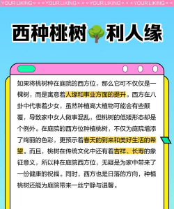 桃树适合栽在院子的东南方位、西南方位、西方位上、南方位。桃树栽在院子的东南方位有旺财的风水作用力,适合做生意经商的主人家;桃树栽在院子的西南方位有利于化解病气的产生,使住宅主人家健康长寿;桃树栽在院子的西方位有助人缘、事业的进步,适合从事文学、医学、设计业工作的主人家;桃树栽在院子的南方位有喜庆、吉利之帮助力。