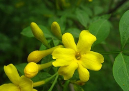 迎春花(学名:Jasminum nudiflorum Lindl.):别名迎春、黄素馨、金腰带,落叶灌木丛生。株高30-500厘米。小枝细长直立或拱形下垂,呈纷披状。3小叶复叶交互对生,叶卵形至矩圆形。花单生在去年生的枝条上,先于叶开放,有清香,金黄色,外染红晕,花期2-4月。因其在百花之中开花最早,花后即迎来百花齐放的春天而得名。