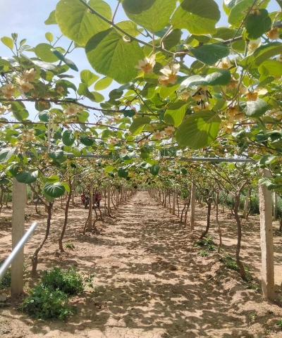 2、定植,猕猴桃定植的时间在秋天到来年开春之前,将猕猴桃的幼苗按照5米×6米的株距种植其中,并且还要在果园中种植20%的雄株用于授粉。定植完成后交一遍定根水,让猕猴桃幼苗的根系能够与土壤更紧密的贴合在一起。