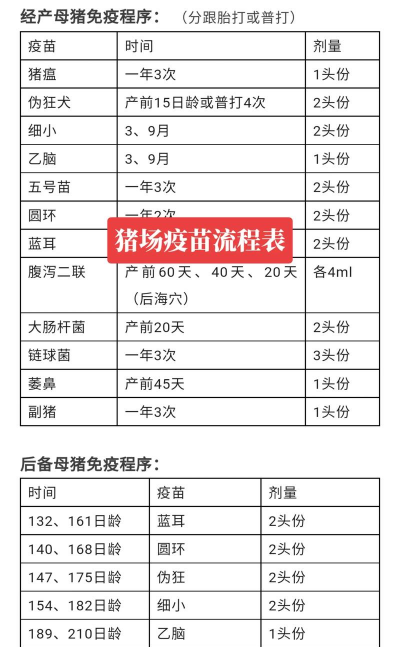 定期接种猪瘟、口蹄疫、伪狂犬病、猪繁殖与呼吸综合征(蓝耳病)等疫苗,春秋季为重点免疫时段。免疫时需“一猪一针头”,防止交叉感染,并监测抗体水平。