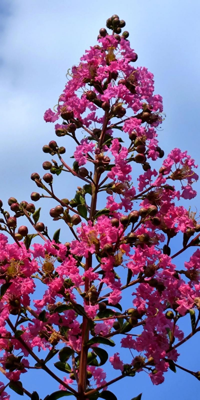 紫薇树一年开一次花,花期在每年6~9月,花期长达3~4个月,紫薇树花色较为丰富,大多呈红色、粉色、紫色或白色,花朵直径在4厘米左右,会在顶梢开放,组成圆锥形花序,可栽种到庭院中起到美化环境的作用。