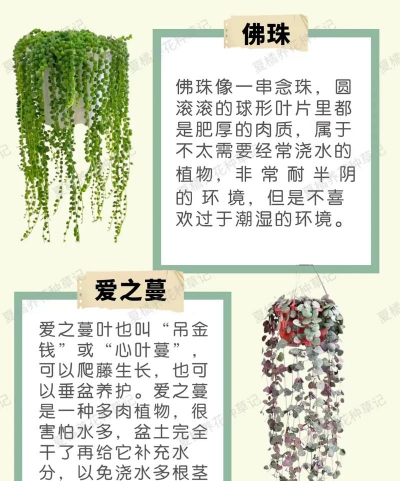 珍珠吊兰:多肉植物,叶片球形如珠子,枝条下垂似珠帘。