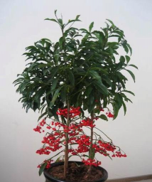 紫金牛盆景的含义为吉祥如意,植株在生长期间会结出鲜红色的果实,具有吉祥的美好寓意,紫金牛一般生长在海拔约1200米以下的山间或竹林下,适合用富含腐殖质、排水良好的土壤栽植,植株生长期需要每隔2-3个月施1次腐熟有机肥。