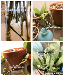 方法:选择健壮的茎蔓,在茎节处刻伤后包裹水苔或直接埋入土中,外用薄膜固定,保持湿润,约20天后生根即可剪下盆栽。