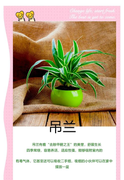 吊兰吸收甲醛的能力较强,能够吸收空气中80%的有害气体,养殖在家中,能够很好得净化空气,对人体的健康有益。养殖吊兰的方法也相对简单,只需要定期补水水分,确保每天拥有充足的阳光照射就行。