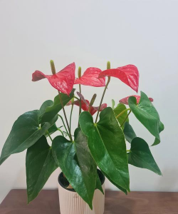 红掌花期长,温湿度适宜时可全年开花,单朵花可持续4-6个月。其佛焰苞色彩明艳,搭配翠绿的叶片,整体如“手掌托火焰”,热烈而华丽,适合盆栽或切花观赏。