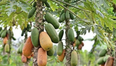 植株高度:木瓜树高5-10米,树皮呈片状脱落,小枝无刺,幼时被柔毛,后脱落呈紫红色或紫褐色。