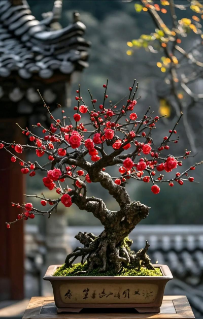 特点:枝条直立或斜展,花瓣深红色,香气浓郁,代表品种有白须朱砂、骨里红等。其木质部呈深红色,与普通红梅(绿色枝条)区别明显,适合表现苍劲古朴的盆景风格。