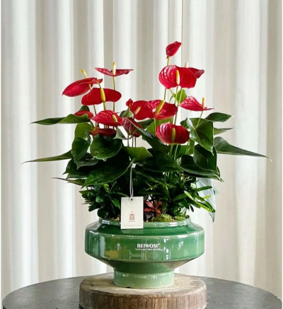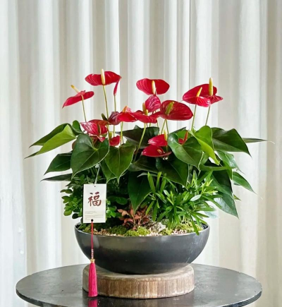 特点:株型紧凑,红花、红梗、红肉穗,佛焰苞夏季不褪色,货架期比一般红掌长1-2个月,适合电商运输。抗病性强,单位面积产值比常规品种高20%以上。