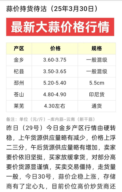 5.0cm:3.00—3.20元/斤,中间价环比上涨0.10元/斤至3.10元/斤(9月16日)市场动态:邳州产区库内蒜供应稳定,卖家出货积极,但买家拿货意愿一般,走货速度较慢,价格整体以稳为主,部分规格小幅波动。主流成交规格为6.5cm红皮净蒜。如需更详细的历史行情或产地直供价格,可参考一亩田平台(如6cm一级净蒜3.80元/斤起批)。