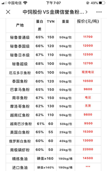 普通级(蛋白≥65%):12500元/吨(秘鲁产,天津港、上海港等)。