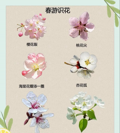 看花柄。樱、梨、海棠的花朵后面有较长的花柄,而桃花和杏花都贴着树干生长。