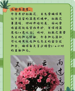 杜鹃冬天养殖有光照、浇水、温度、施肥等养护管理措施。每天可以进行大量光照,即可以整日阳光照射。当盆土干燥时则可以浇水保持略微湿润,温度低于0度摆放在室内光照明亮位置,在越冬前施加一次有机液肥,冬季不可施肥。