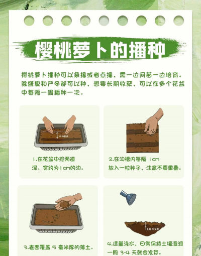 播种前先把土壤浇透水,使土壤处于微微湿润的状态,之后将樱桃小萝卜的种子播种进去即可,播种好后可以在土壤的表面覆盖上一层薄膜,这样能起到保温保湿的作用,很快它就能够出苗生长。