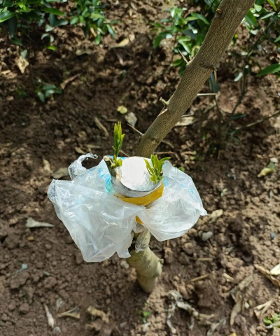 一般为柚子树进行的嫁接工作都是使用切接法、腹接法或是芽接法这三种方法,而春季进行嫁接的话多半都是使用切接法,也就是在作为砧木的柚子树的断面上打出缺口,然后再将削尖的橙子接穗插入缺口中,紧密缠绕包裹薄膜。