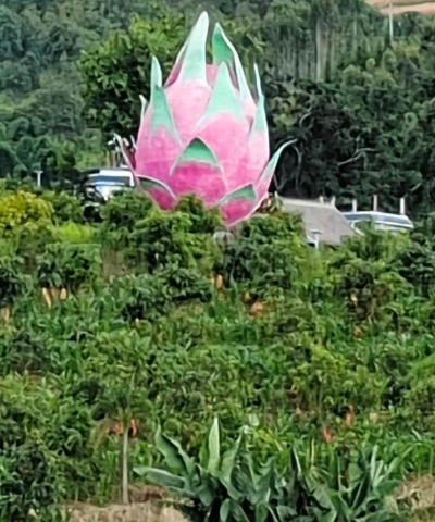 若以文字还原图像,可想象:一株墨绿色三棱柱形茎干攀附在支架上,茎边缘布满短刺,顶端垂下巨大的白色花朵;成熟季节时,枝条上悬挂着红色椭圆形果实,表皮鳞片如龙鳞般张扬。