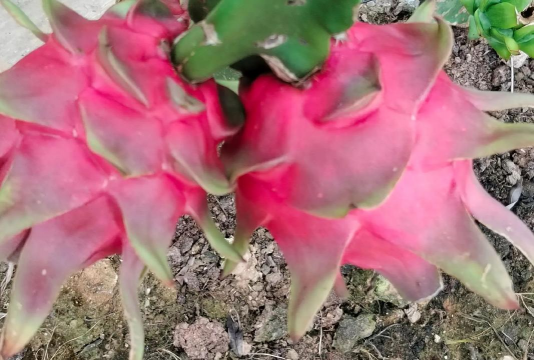 火龙果树为攀援性肉质灌木,依靠气根附着于墙壁、岩石或其他支撑物上生长,整体形态类似仙人掌,但枝条更细长且分枝繁茂。老枝常呈淡褐色,质地坚硬。