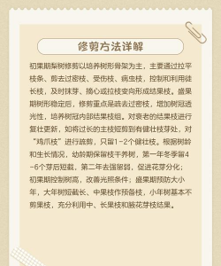 1、春季修剪:将弱枝、无用枝剪除,减少养分消耗。2、夏季修剪:将密集枝、徒长枝剪除,提高植株间的透气性。3、秋季修剪:花果期将枯枝老枝剪除,起到疏花疏果的作用。4、冬季修剪:将病虫枝、杂乱枝剪除,让梨树顺利越冬。